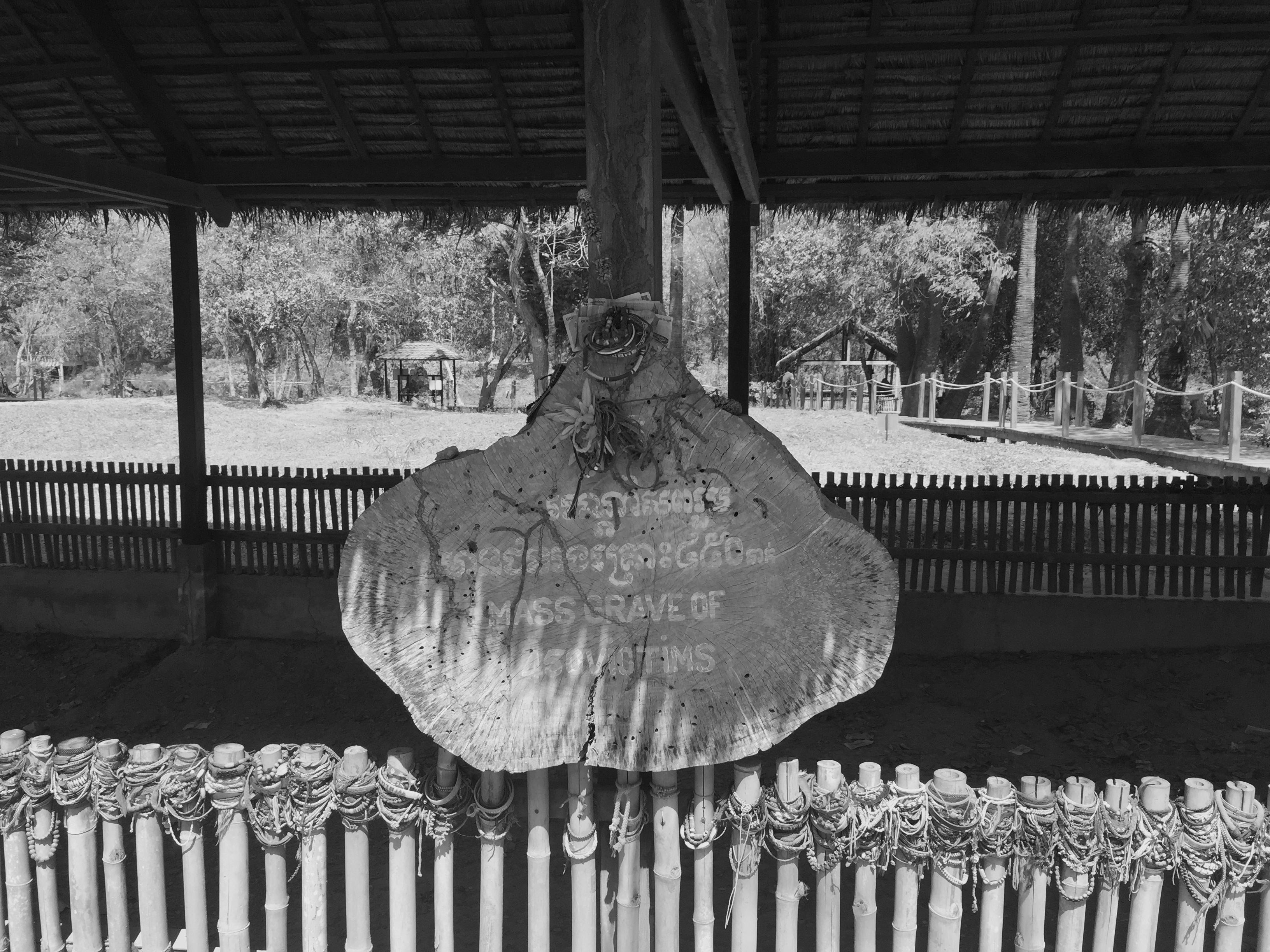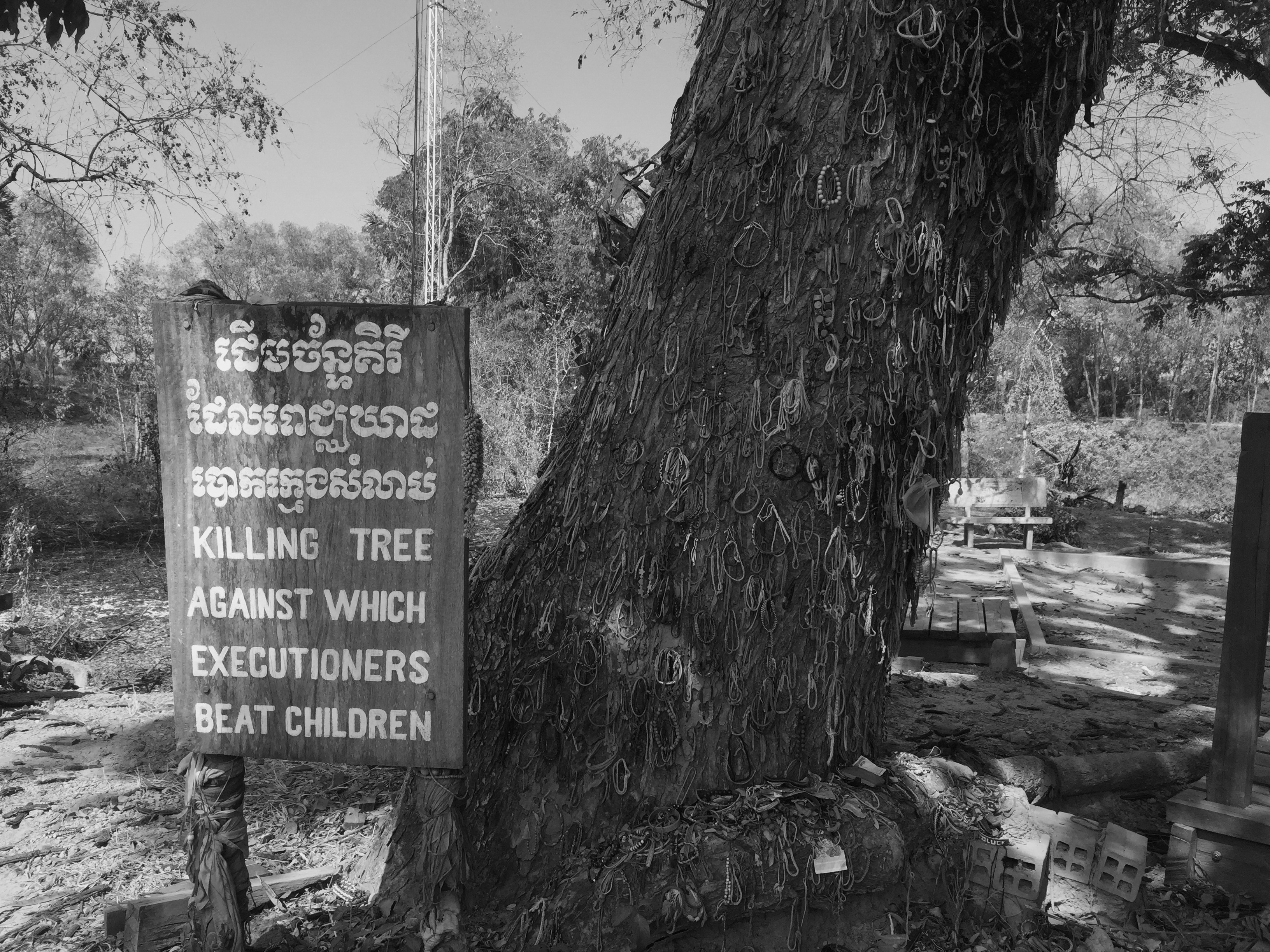 After confession they were driven out of Phnom Penh some 14 km to Choeung Ek, The Killing Fields closest to the capital city where they were unloaded, accounted for and in darkness the same night walked into the field and one by one hit over the head with a shovel and into a mass grave. The prison chief went so far as to kill babies to prevent them returning to avenge their parents, so he instructed his officers to swing the babies by their feet and hit their heads into a tree and into a mass grave.