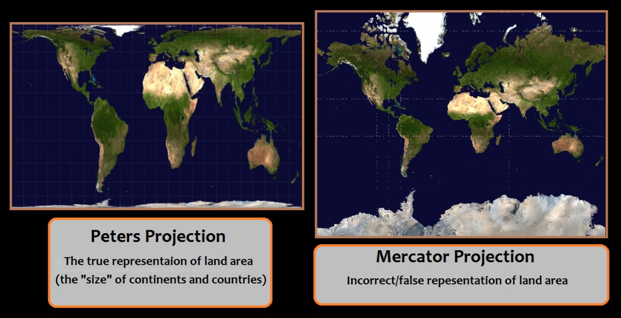 The correct format for mapping the world with country comparative size to each other is the Peters projection map. However, because most people are happily unaware of this notion, they will look at a Mercator projection map and believe that the country Greenland is actually bigger than the continent of Africa.